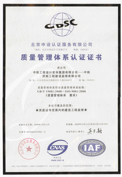 中鐵濟(jì)南工程建設(shè)監(jiān)理有限公司成立于1995年1月,為中鐵工程設(shè)計咨詢集團(tuán)有限公司的全資子公司。公司具有鐵路工程、市政公用工程、房屋建筑工程三項監(jiān)理甲級資質(zhì)及造價咨詢甲級資質(zhì),能夠開展相應(yīng)類別建設(shè)工程的項目管理、技術(shù)咨詢等業(yè)務(wù)。公司始終堅持科學(xué)管理,認(rèn)真貫徹ISO9000質(zhì)量管理體系,實(shí)行標(biāo)準(zhǔn)化管理,強(qiáng)化思想教育和業(yè)務(wù)培訓(xùn),逐步形成了完善的管理制度,2000年通過了ISO9001質(zhì)量管理體系認(rèn)證。