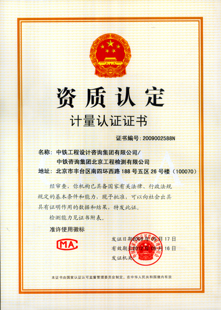 檢測公司是中關(guān)村高新技術(shù)企業(yè),具有國家認(rèn)證認(rèn)可委員會頒發(fā)的國家資質(zhì)認(rèn)定計(jì)量認(rèn)證證書,北京市建委頒發(fā)的“建設(shè)工程質(zhì)量檢測機(jī)構(gòu)”資質(zhì)證書,是鐵道部工程質(zhì)量安全監(jiān)督總站確定的“第一批鐵路建設(shè)工程質(zhì)量監(jiān)督檢測機(jī)構(gòu)”。