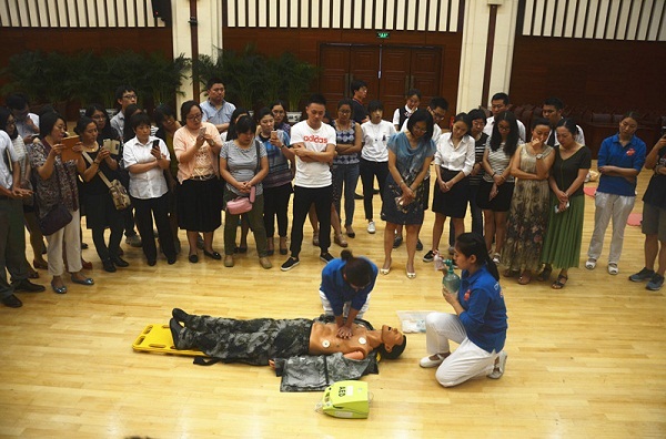 活動邀請到了中國人民解放軍總醫(yī)院急診科副主任醫(yī)師、國家級應(yīng)急救援隊成員田萬管主任等一行14人組成的培訓(xùn)小組,對青年志愿者們進行了理論授課和現(xiàn)場演練。田主任首先從如何判斷受傷情況、現(xiàn)場做緊急處置的方法進行了講解,然后對創(chuàng)傷救護四大技術(shù)“止血、包扎、固定、搬運”進行了詳細的介紹和培訓(xùn)。隨后進行了現(xiàn)場分組演練,培訓(xùn)小組成員手把手的指導(dǎo)青年志愿者們進行單人/雙人徒手心肺復(fù)蘇、AED急救實施、止血、包扎、固定、轉(zhuǎn)運等實操訓(xùn)練。