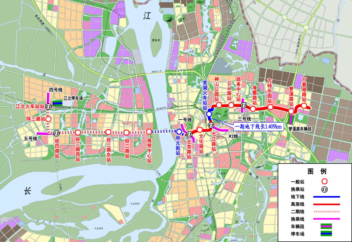 蕪湖市軌道交通1號(hào)線工程起于保順路站,終于白馬山站,呈南北走向,線路全長(zhǎng)約30.460km,共設(shè)車站25座,全部為高架車站,其中換乘站3座。蕪湖市軌道交通2號(hào)線一期工程起于北京路站,終于萬(wàn)春湖路站,呈東西走向,線路全長(zhǎng)約15.796km,共設(shè)11座車站(高架站10座、地下站1座),換乘站3座。共設(shè)置停車場(chǎng)1處、車輛段2處, 2019年12月底建成,2020年1月初開(kāi)通試運(yùn)營(yíng),2021年正式運(yùn)營(yíng)。