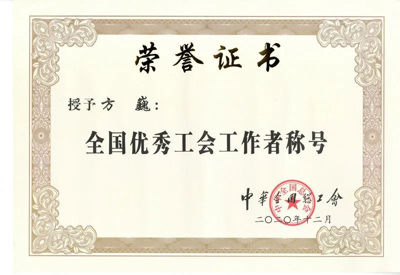 2020年獲中華全國總工會授予的“全國優(yōu)秀工會工作者”稱號