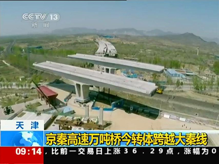 4月16日上午10時(shí),集團(tuán)公司橋梁院設(shè)計(jì)的京秦高速公路跨大秦鐵路分離式立交橋成功轉(zhuǎn)體就位。該橋采用雙幅同步轉(zhuǎn)體62度跨越大秦鐵路,單幅轉(zhuǎn)體重量9600噸,單幅轉(zhuǎn)體長(zhǎng)度60+60米。中央電視臺(tái)、天津電視臺(tái)等多家主流媒體對(duì)轉(zhuǎn)體現(xiàn)場(chǎng)進(jìn)行了報(bào)道。