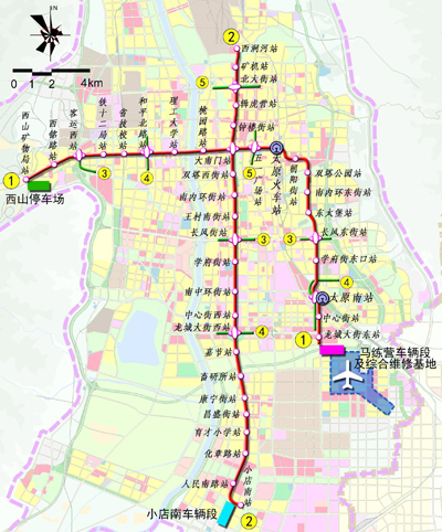 太原市軌道交通1號(hào)線一期工程起于西山礦務(wù)局,終于龍城大街東站,于太原市內(nèi)呈倒“L”形分布,東西向沿迎澤大街,途經(jīng)客運(yùn)西站、理工大學(xué)、大南門(mén)、柳巷、五一廣場(chǎng)、太原站等客流集中點(diǎn),南北向沿朝陽(yáng)街、太行路、馬練營(yíng)路敷設(shè),途經(jīng)朝陽(yáng)街服裝城、雙塔公園、東太堡、太原南站綜合交通樞紐等地。1號(hào)線一期工程是聯(lián)系迎澤、武宿兩個(gè)市級(jí)中心和太原站、太原南站兩個(gè)鐵路交通樞紐的骨干線路,線路全長(zhǎng)約24.07km,設(shè)橋梁1座,長(zhǎng)約0.215km,其余全為地下線;共設(shè)置車(chē)站21座,全部為地下站,在線路西端設(shè)西山礦務(wù)局停車(chē)場(chǎng)1座、南端設(shè)馬練營(yíng)車(chē)輛段及綜合維修基地1座,全線網(wǎng)共享控制中心1個(gè)。太原市軌道交通1號(hào)線于2010年完成工程可行性研究報(bào)告初稿,擬采用6輛編組的B型車(chē)、1500V接觸網(wǎng)供電,估算總投資157.9億元,計(jì)劃2013年開(kāi)工建設(shè),2017年建成通車(chē)。1號(hào)線是太原市先期啟動(dòng)建設(shè)的軌道交通線路之一,是一條客流需求和規(guī)劃引導(dǎo)兼顧的大運(yùn)量線路,在太原市軌道交通線網(wǎng)中具有重要的地位和作用,其建設(shè)可改善迎澤和武宿兩大市級(jí)中心的居民出行條件,緩解中心城區(qū)交通壓力,對(duì)引導(dǎo)沿線城市健康有序發(fā)展、土地合理使用及加快城市化進(jìn)程等均有積極促進(jìn)作用。