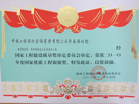 2010年12月23日,在北京人民大會堂召開的確保國家重點(diǎn)工程質(zhì)量創(chuàng)建國家優(yōu)質(zhì)工程表彰大會上,煙臺火車站站房工程榮獲國家優(yōu)質(zhì)工程獎銀質(zhì)獎。