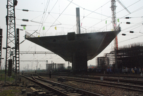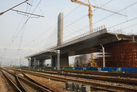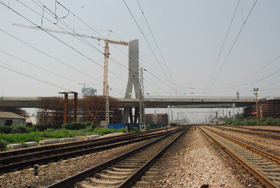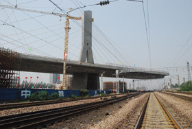 河北省第一座公路轉(zhuǎn)體斜拉橋,其轉(zhuǎn)體重量及轉(zhuǎn)體角度均居世界同類橋梁領(lǐng)先水平。該橋主橋?yàn)?5+85+85+45米四跨連續(xù)獨(dú)塔單索面預(yù)應(yīng)力混凝土部分斜拉橋,橋面全寬33m,橋面整幅布置。主橋結(jié)構(gòu)采用墩、塔、梁固結(jié)體系,設(shè)8對(duì)斜拉索。該橋轉(zhuǎn)體長(zhǎng)度為71+71m,轉(zhuǎn)體角度為75.74,轉(zhuǎn)體重量為16200t。