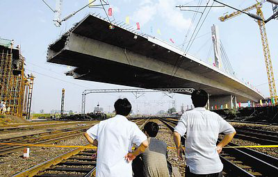北京市五環(huán)路石景山南站特大橋主橋跨越石景山南站編組站咽喉區(qū),鐵路線間距小、行車密度大,為了既能快速、安全地在電氣化鐵路站場上加起高架橋,又可不干擾或盡量少干擾正常的鐵路運輸。該橋主橋采用了轉(zhuǎn)體法施工的45+65+95+40m四跨連續(xù)獨塔單索面預(yù)應(yīng)力混凝土曲線先拉齊奧,轉(zhuǎn)體重量達14000噸。該橋或2005年度國家優(yōu)質(zhì)工程銀質(zhì)獎,2006年度建設(shè)部優(yōu)秀設(shè)計一等獎,全國優(yōu)秀工程設(shè)計金質(zhì)獎。