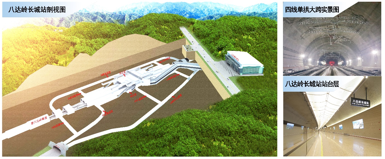 八達(dá)嶺長(zhǎng)城隧道地處八達(dá)嶺核心風(fēng)景區(qū),全長(zhǎng)12公里。八達(dá)嶺長(zhǎng)城站設(shè)在新八達(dá)嶺隧道內(nèi),車站為三層三縱結(jié)構(gòu)的復(fù)雜洞室群地下車站,相鄰洞室最小水平間距2.2米、最小垂直間距4.5米,最大埋深102米,站隧過渡段為超大跨結(jié)構(gòu),最大跨度32.7米,地下部分建筑面積4萬平方米。中鐵設(shè)計(jì)研發(fā)了超大跨松散圍巖隧道修建技術(shù),解決了深埋地下站防災(zāi)救援疏散、舒適環(huán)境構(gòu)建、小凈距洞群穩(wěn)定及超長(zhǎng)耐久性等系列難題,實(shí)現(xiàn)了世界上埋深最深、規(guī)模最大的全暗挖站隧一體高鐵車站。